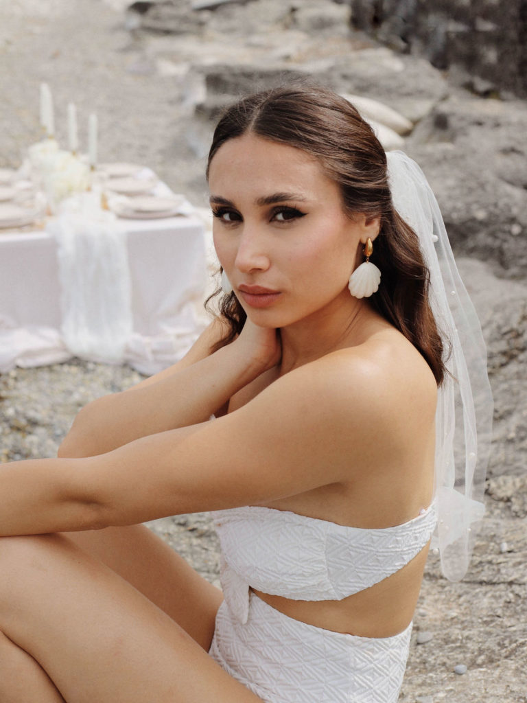 La future mariée, parée d’un voile léger et d’un deux pièce festif, est entourée de ses proches dans une ambiance intime. Chaque élément a été pensé pour sublimer l’instant : des maillots de bain assortis, de l’huile corporelle pour être au top de la tête au pied, une décoration de table dan le tons rappelant le sable et des touches de mer.